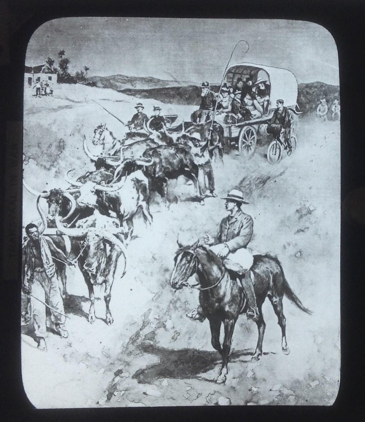 News just in. A runner presents vital information to his British masters. The artist’s name is visible in the right-hand corner of the sketch. The image originated from “The Graphic”. This slide formed part of the ‘Transvaal in War’ magic lantern series.