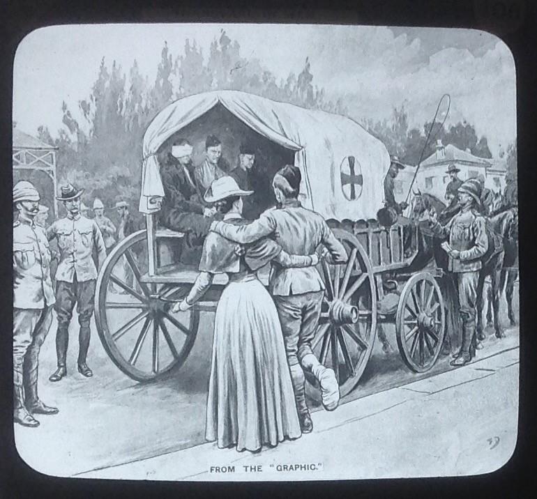 A British soldier assisted into an ambulance wagon. The initials of the unknown artist appear in the bottom right-hand corner of the slide. The image originated from “The Graphic”. This slide formed part of the ‘Transvaal in War’ magic lantern series.