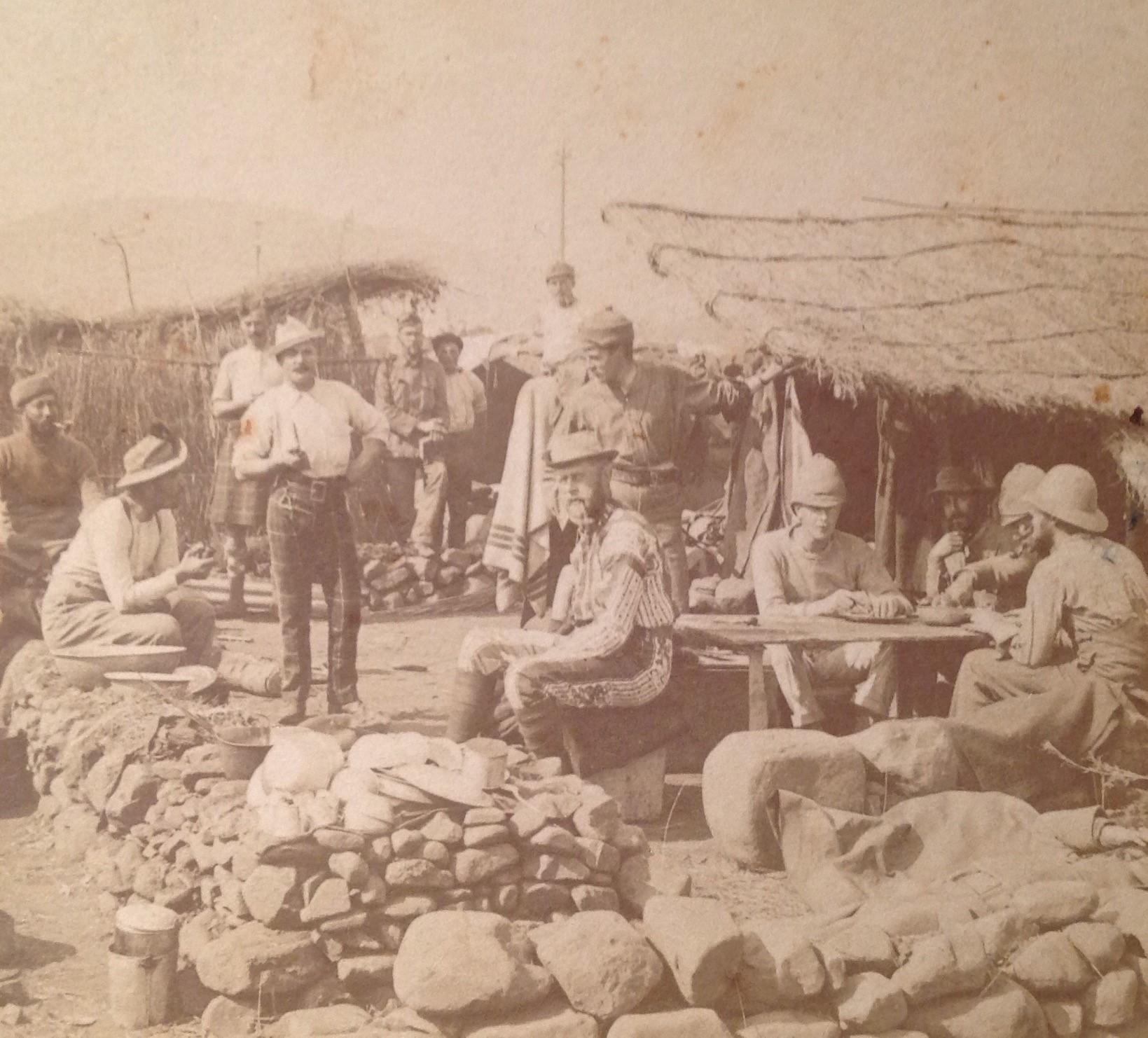 Taking breakfast on a Boer farm. Two of the individuals can be seen wearing medic armbands. The lady in the photograph can also been seen on at least two other Kilburn photographs.