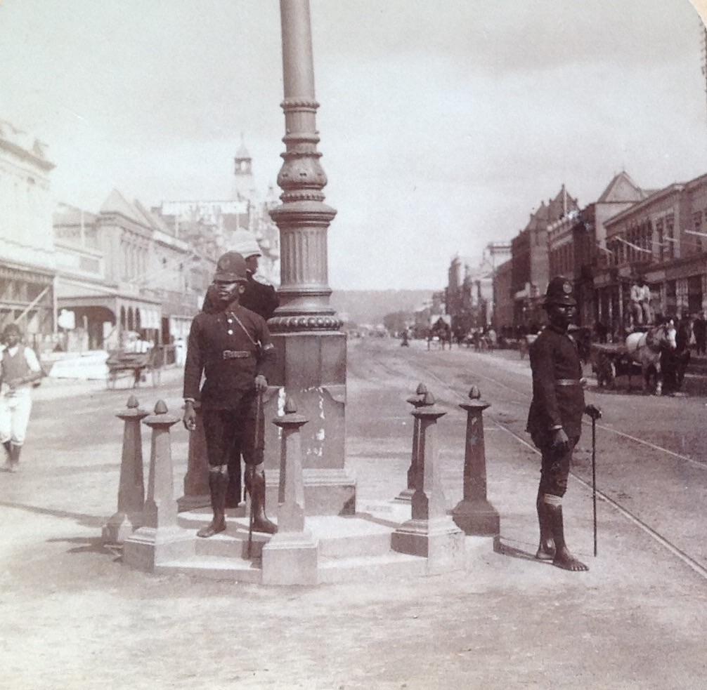 Underwood & Underwood photographers assigned to photographing the Anglo-Boer war did not restrict themselves in capturing images of the war only. Whilst they were passing through towns, they also captured images of day-to-day activity of the local population. The two images above show Zulu police men in West street in Durban and civilians attending a market in Cape Town (men in uniform can be spotted in the latter image)