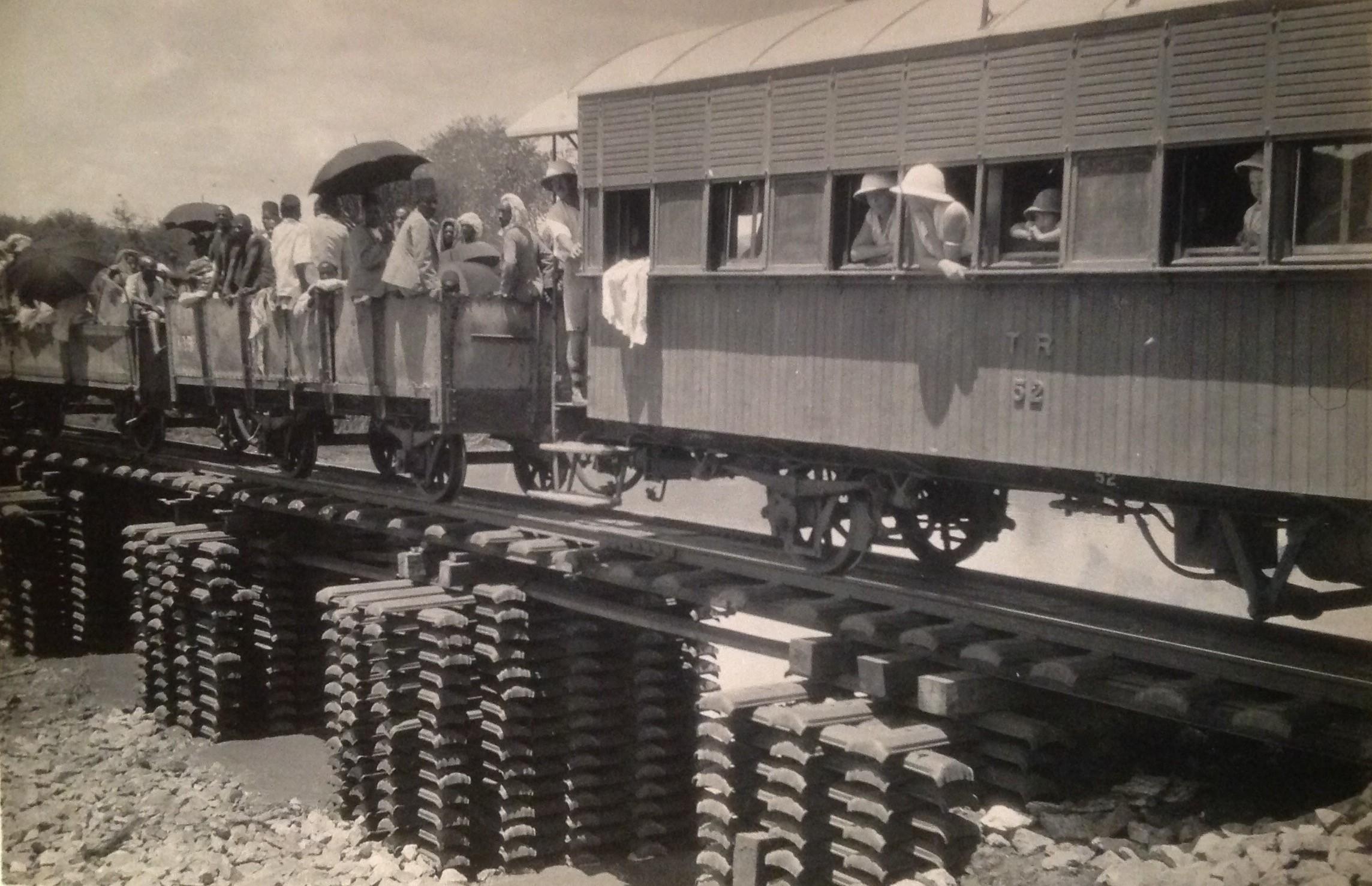The rail line has just been rebuilt after being washed away. Location unknown. The “TR” on the carriage in front would suggest that this image was taken in Tanganyika (Tanzania today)
