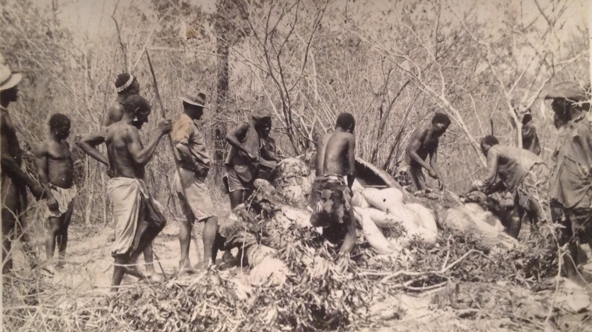 The purpose of shooting an elephant remains questionable. Yet, one of the photographs confirms that the meat did not go to waste in that the locals were assisting in slaughtering the animal – mainly for their benefit.