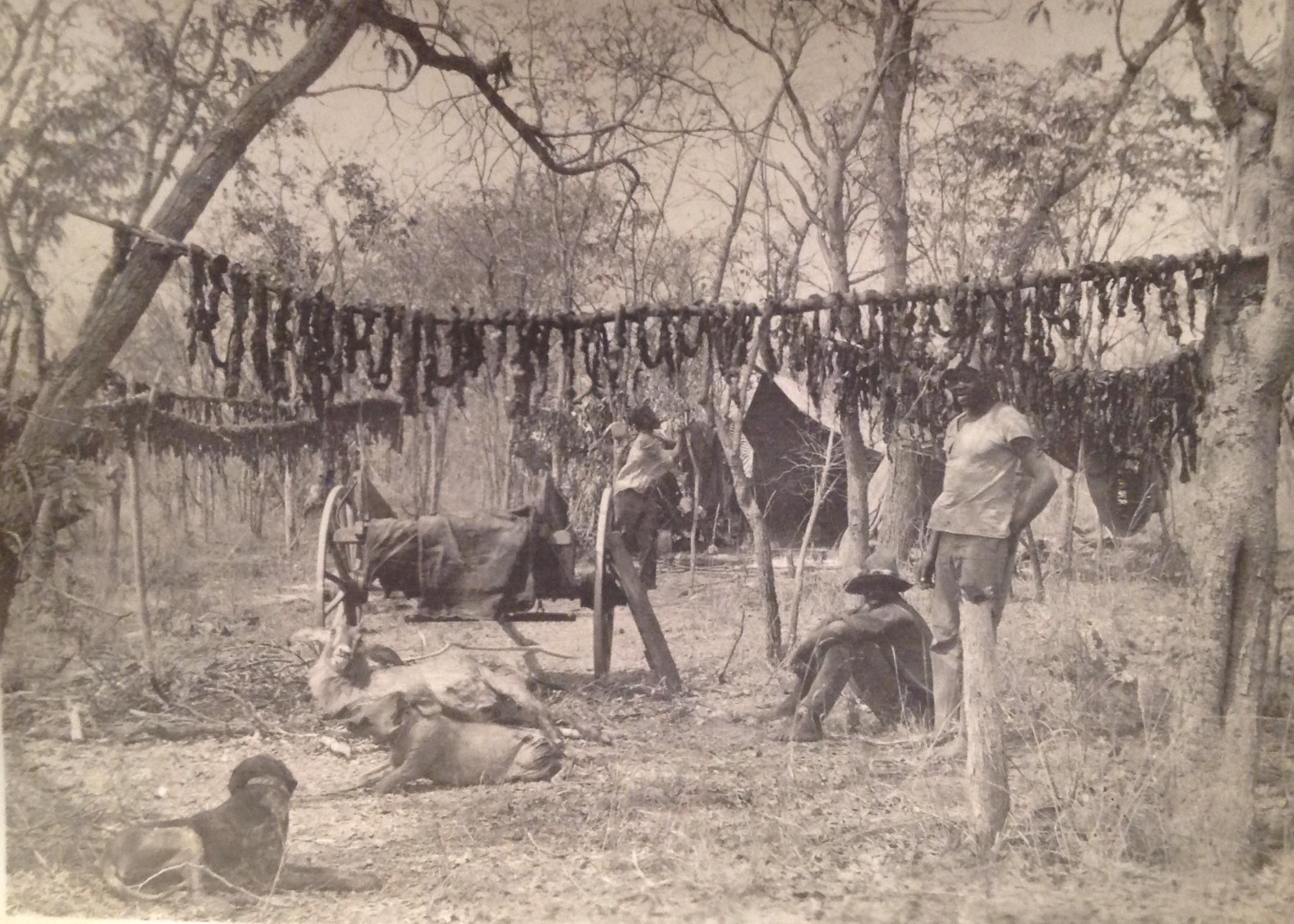 The purpose of hunting was also to feed the construction workers, in that one photograph shows plenty of biltong hung out, along with more game awaiting slaughter.
