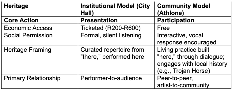 A more complex test of this tension is imminent. On 6 and 7 March, Artscape will host The Kingdom of Ubuntu, a large-scale "reimagined afro-epic." With tickets priced between R150 and R300, it is an institutional effort to present a reconfigured heritage. Its artistic intent directly engages with the UNESCO principle of living heritage. Yet, by staging it in the city's premier performing arts complex, it encounters the same structural dilemma: does transformative content alone recompose an audience, or must the institution's relationship with the city, its geography, pricing and “outreach”, be deliberately redesigned to match?
