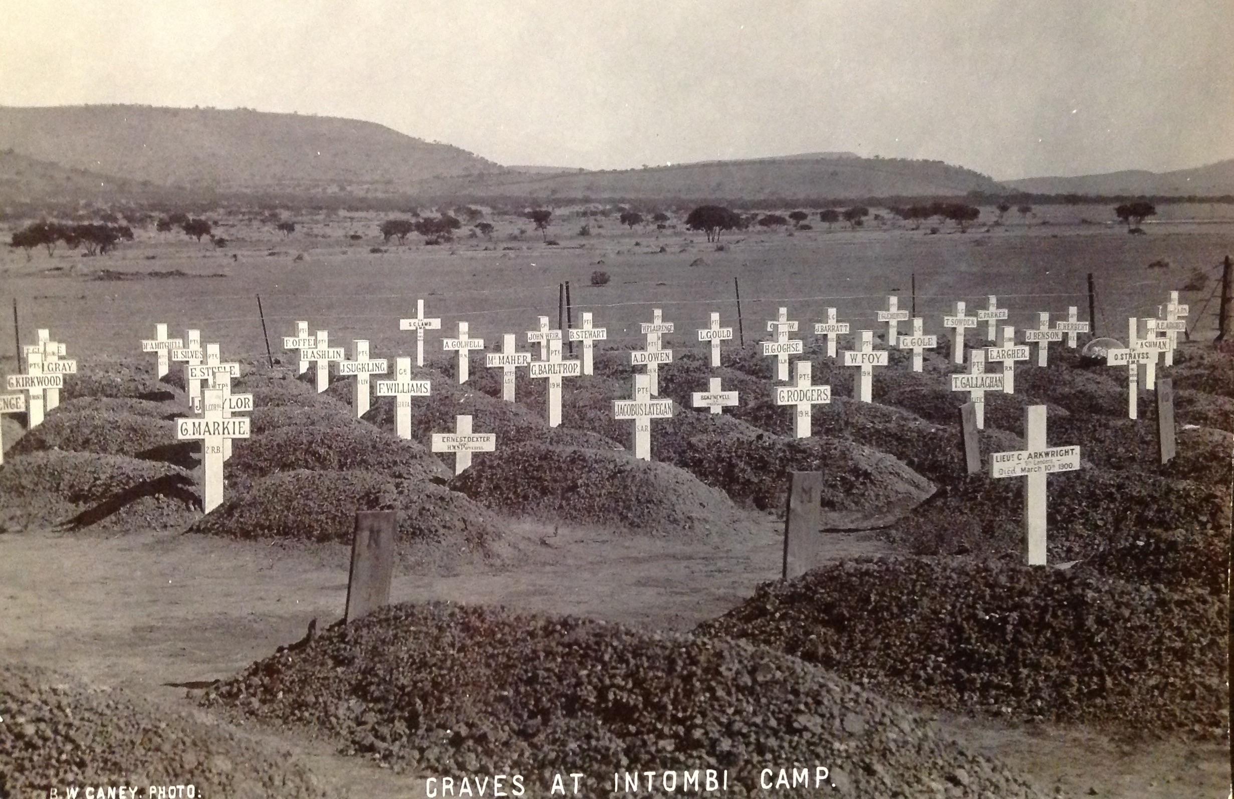 Graves at Intombi Camp (43 white crosses from left, back to front – starting from 2nd cross as 1st cross is obscured):