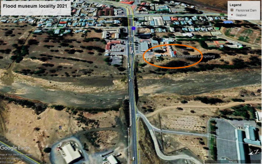 The locality of the Flood Museum (shown by orange circle) next to the N1 motorway and the Buffel’s River (Google Earth image, 2021). The Old Age Home demolished by the flood was to the right of the museum prior to the 1981 flood.