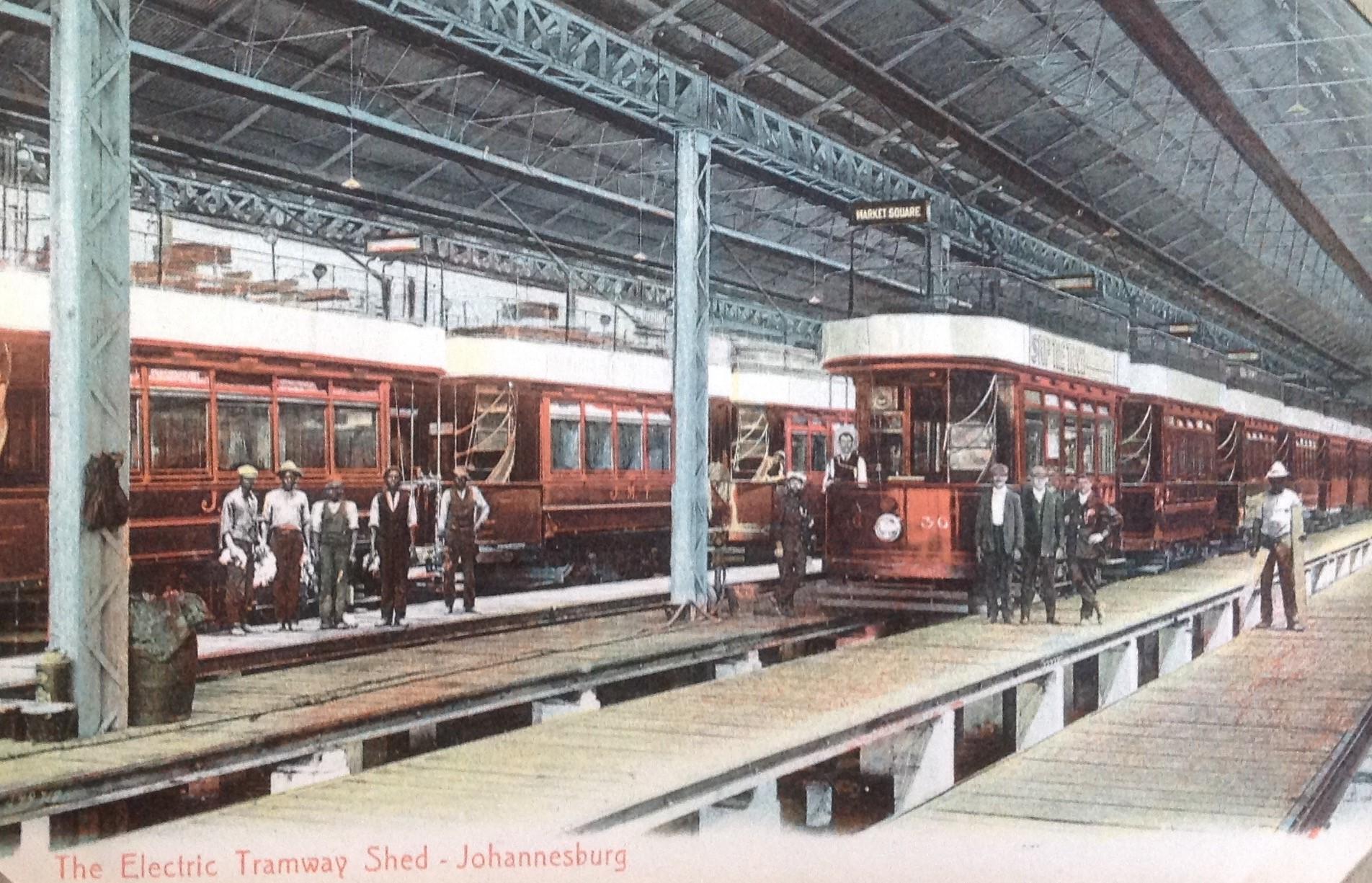 Hand coloured picture postcard showing the Johannesburg Electric Railway Shed. Card number 2554 was published by Sallo Epstein & Co (circa 1900).