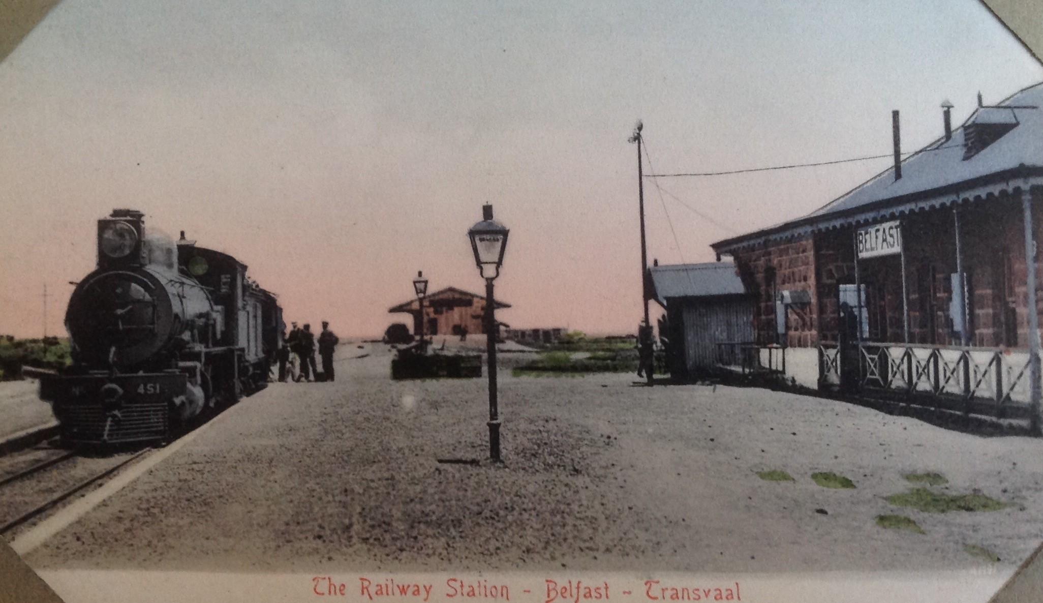 Hand coloured picture postcard showing Randfontein railway station. Card number 1618 was published by Braune and Levy (circa 1900).