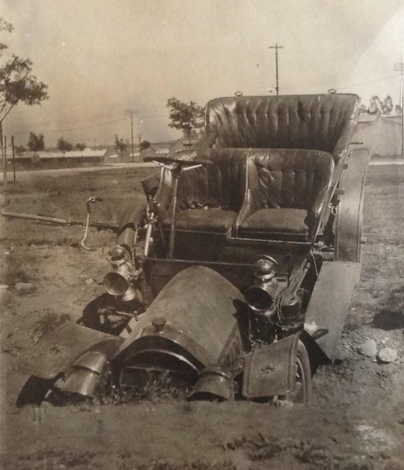 Amateur photograph of fatal vehicle accident. The driver, one Gross, drove his vehicle into the ditch in Benoni in 1914.