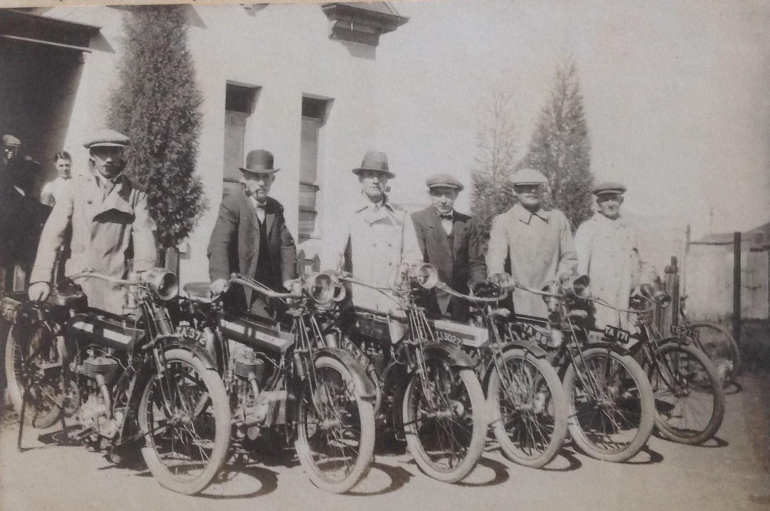 Amateur photograph of the Benoni Flying Squad in 1916. The detectives standing at their motorcycles are from left to right: Murphy, Burns, Willis, O’Connor, Grosvenor & Rae. The registration plates on the bikes are TA (Benoni), TB (Boksburg) and TJ (Johannesburg)