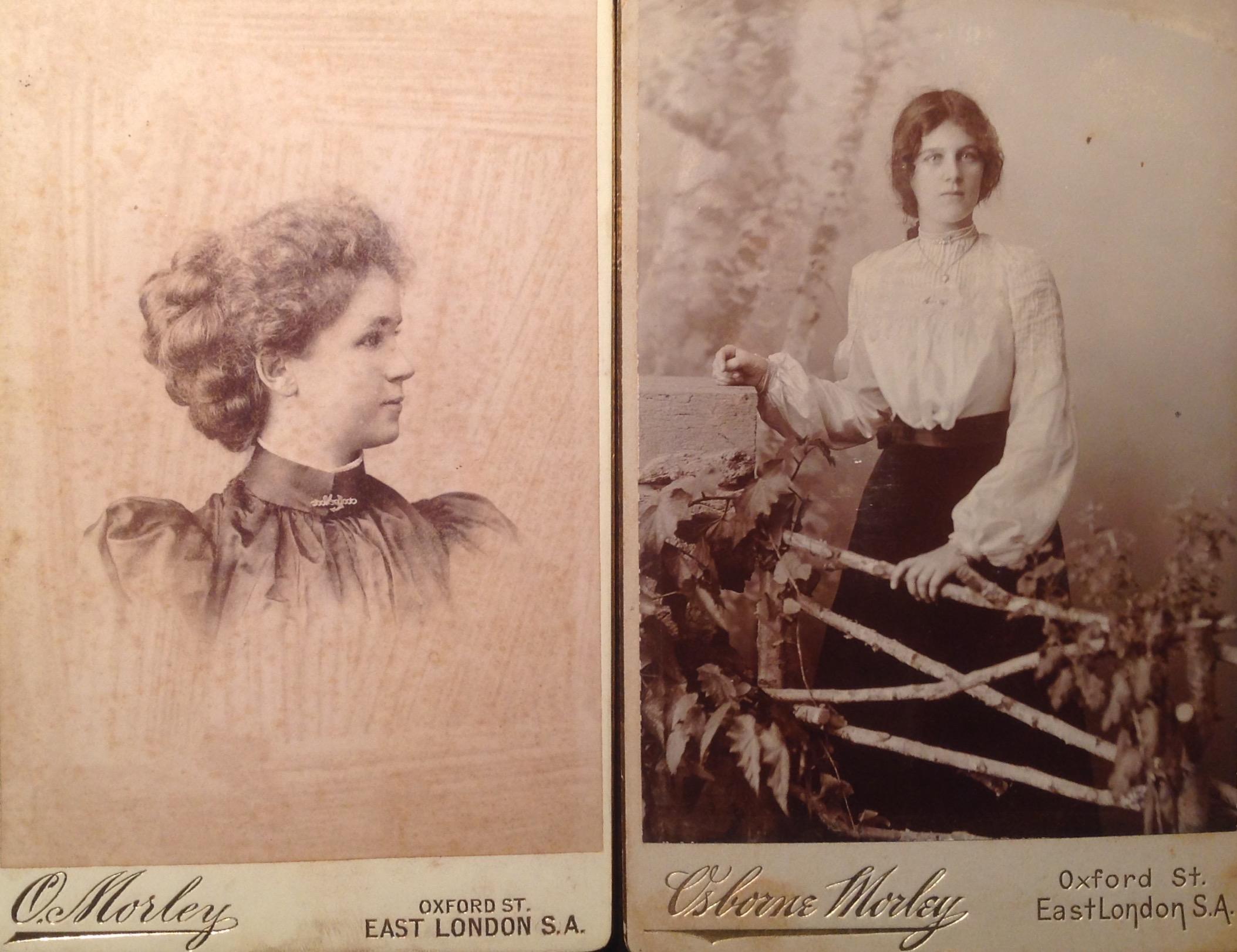 Main image: Cabinet card format photograph by East London based photographer Osborne Morley (January 1902). The following inscription appears on the back of the card: With love to dear grandma from little Winnie and Dorothy