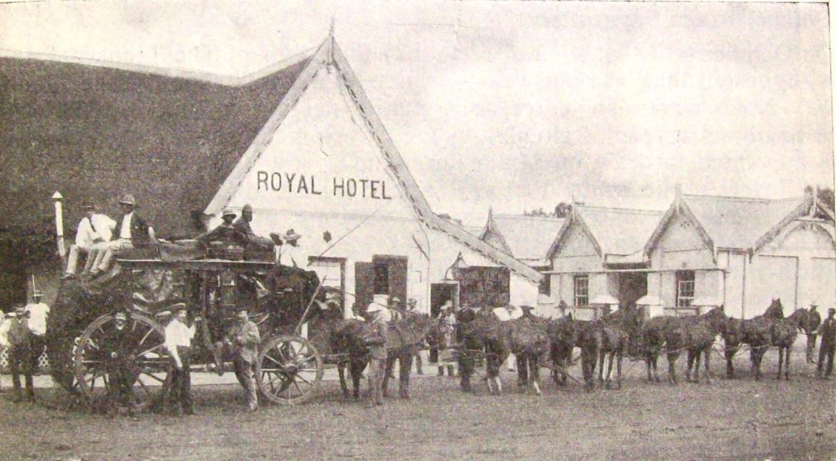 The first hotel in Potchefstroom, the Royal Oak, was opened in 1860 on the corner of Kerk and Lombard Street (Walter Sisulu and James Moroka). It was built by a Mr. Rocher and later the owner was George Coulson. It was also the relay depot for coaches carrying passengers and cargo. The hotel stood on the corner of James Moroka and Walter Sisulu Avenue, where the Royal Building is situated today.