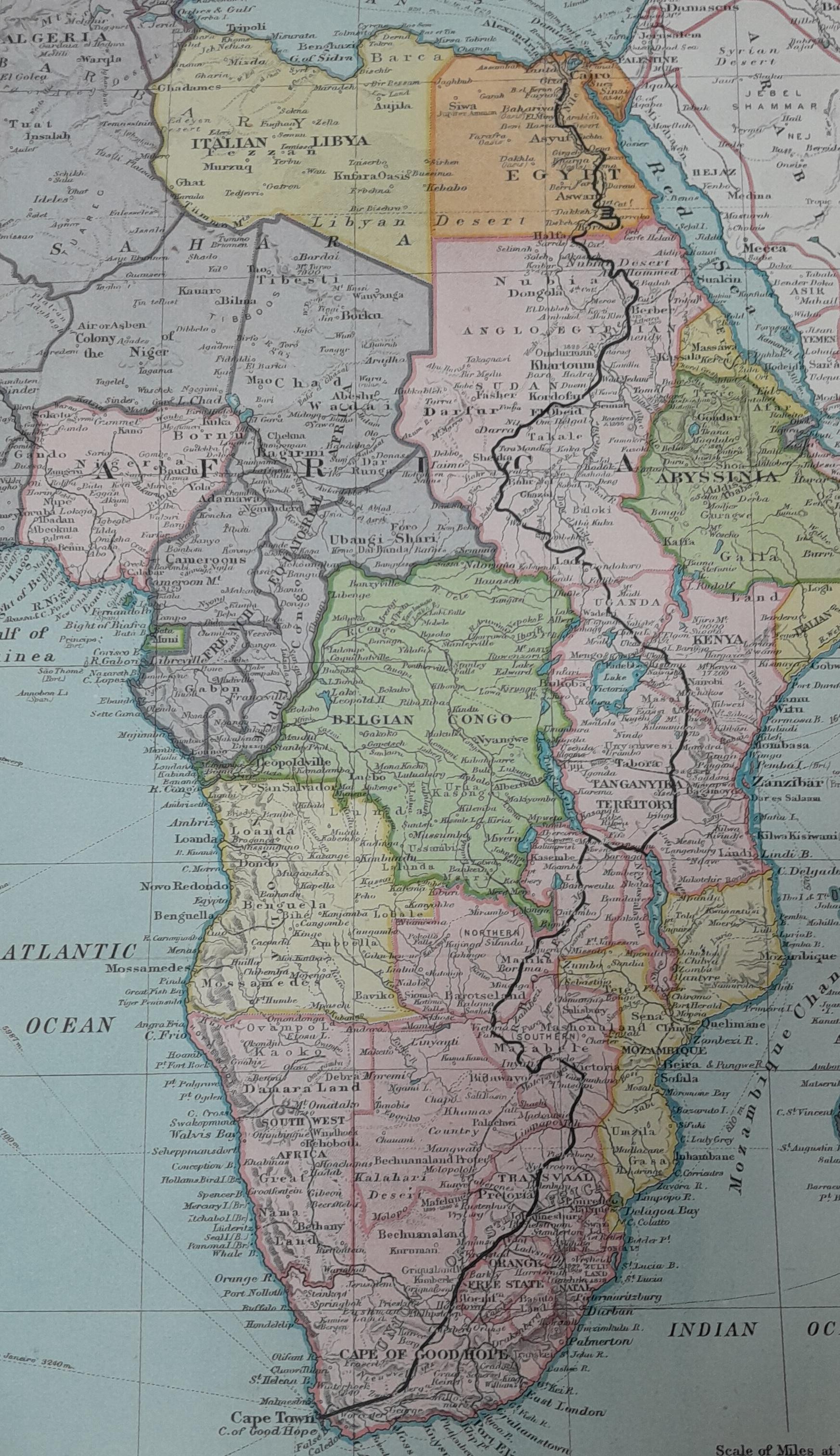 This map was a supplement to Stella Court Treatt’s book, Cape to Cairo, and indicates their route over colonial territory that was coloured in red (pink).