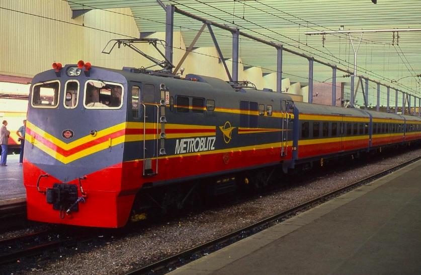 Here is the ‘Metroblitz’ train set that provided the very first daily fast train service between Pretoria and Johannesburg, running on the existing standard main line via Germiston in just 43 minutes! It didn’t enjoy the luxury of a dedicated direct line to Pretoria from Johannesburg. The ‘dog’s leg’ via Germiston made this performance even more noteworthy on the 3ft 6in gauge!’