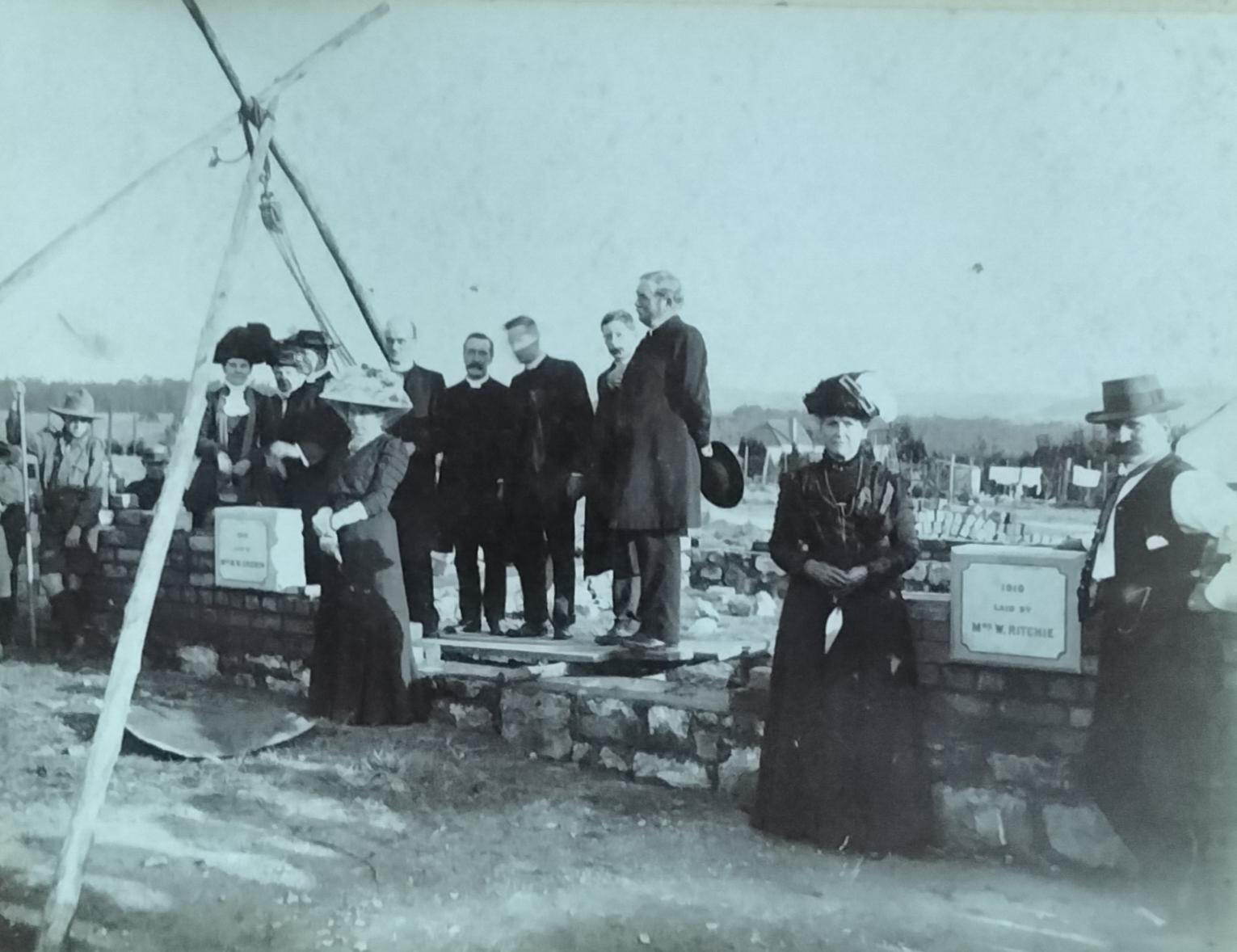A cornerstone of a building was unveiled by two ladies in 1910 (One being Mrs. W. Richie). The clergymen surrounding the ladies suggest that this was a church being built. Somewhere a church historian may identify and confirm the location of where the photograph was captured as well as the denomination (Catholic?). There are two photographers at work at this significant event. Note the shade of the second photographer falling on the lady standing on the left. Also, note the Boy Scout standing on the left.