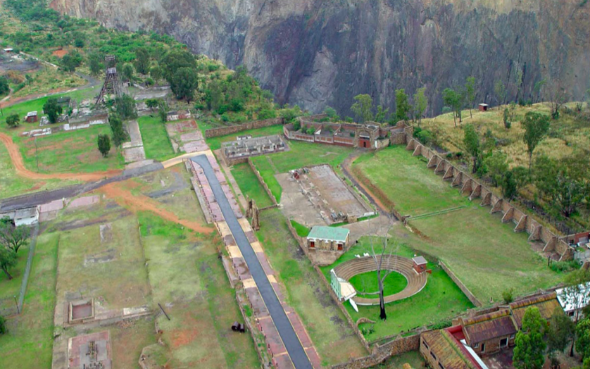 Below are photographs of the compounds from above. The first shows two shaft (now abandoned). On the edge of the pit are the administrative offices and gate into the mine workings. Movies were shown in the amphitheatre at the bottom right of the photo and next to the open air theatre is the ticket office. The open air washing facilities, now mainly in ruins, can also be seen. In the second photo, across the open pit is the Cullinan Diamond Mine and Seven Dam.
