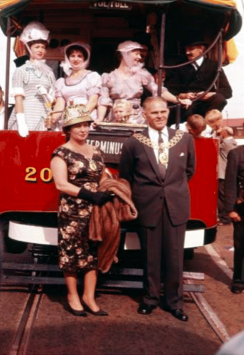 The Mayor and Mayoress posed for a photo with old No.20 at the Malvern Tram Terminus