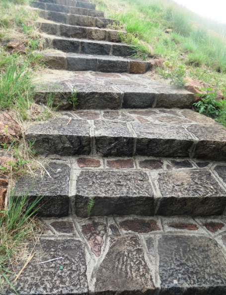 Reaching the Memorial - a stairway to the Hill Top. To reach the monument one climbs a set of gently rising, wide tread steps made of Witwatersrand quartz. The stairs are in excellent condition and must have been renewed at some point.
