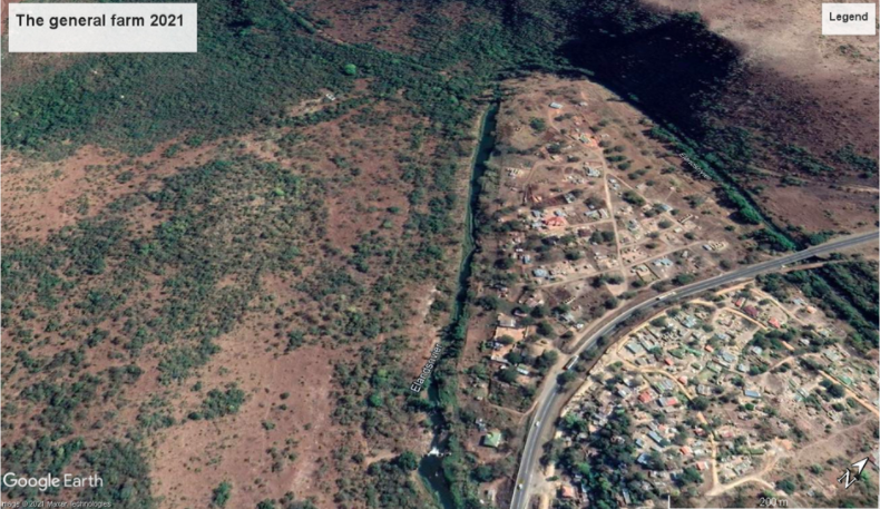 The same area in 2021. The farm house is derelict and the area across the Elands River is an informal urban sprawl. The N4 motorway had been built. The farm is no longer being worked and the ploughed field is overgrown. Google Earth image 2021.