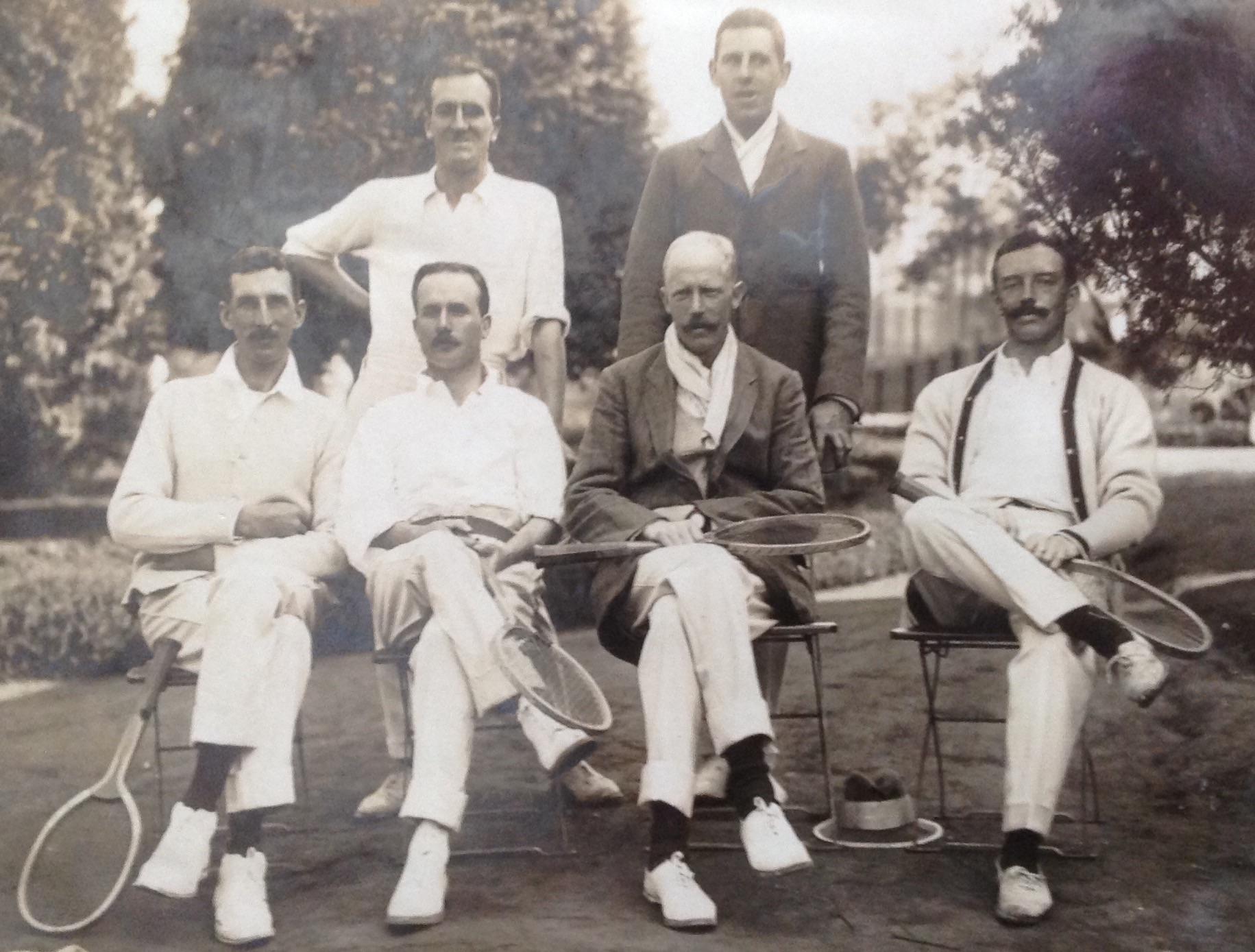 2nd Test match. South Africa vs AW Myers team 1911. Arthur Wallis Myers, assumed to be the gentleman in the striped jacket standing at the back, was the English tennis captain. Myers was also a leading tennis journalist and author. Lord and Lady Gladstone are seated in the centre. Herbert John Gladstone (1st Viscount Gladstone) (7 January 1854 – 6 March 1930) was a British Liberal statesman and Home Secretary (1905 to 1910) and Governor-General of the Union of South Africa (1910 – 1914). He was married to Dorothy Mary Paget (1876–1953). Bottom left is Harry Kitson and back right is RF le Sueur. The gentleman standing in the middle at the back (PW Bridges) and the one seated in the front on the right also appear together in other images contained in this article