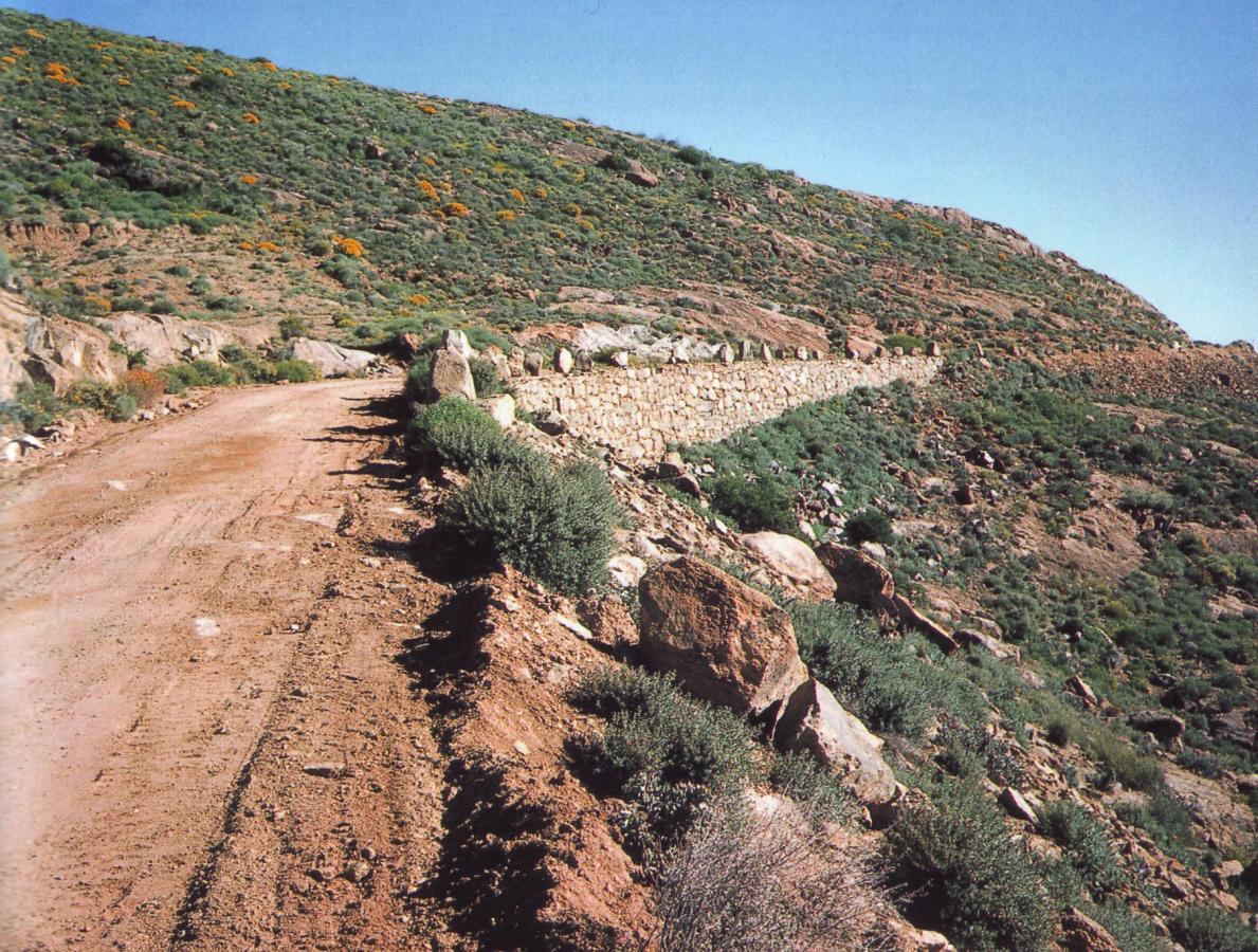 It was a tough job, carried out by convicts supervised by "totally inexperienced" overseers. The major feature of the route was the Messelpad Pass (see main image), built between 1867 and 1871, and is still in use, for all practical purposes, in its original form. Despite the labour problems – and droughts and cattle sickness – the workmanship was excellent. The dry-stone retaining walls, which solved the problem of the tumbling wagons compare favourably with those built by the Bains on better known passes further south. The pass has been declared a National Monument.