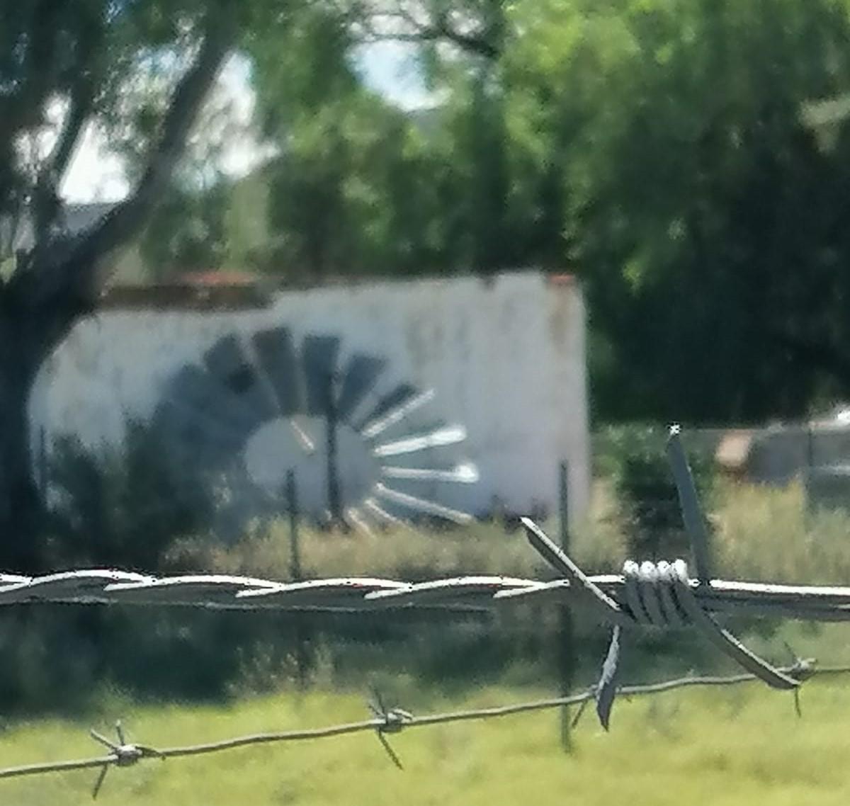 Blades behind barbed wire fencing near Bethulie. Does the bladeless structure to which these blades belong stand nearby? Photograph by Leslie Bennett.