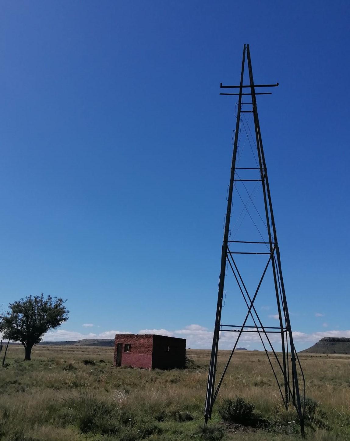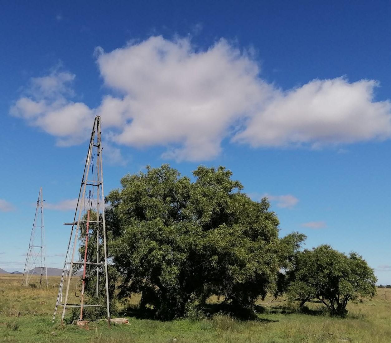 Two steel sentinels that have fallen into disuse standing next to each other. Only the foundations of the farmhouse it used to serve remain – near Gariep.