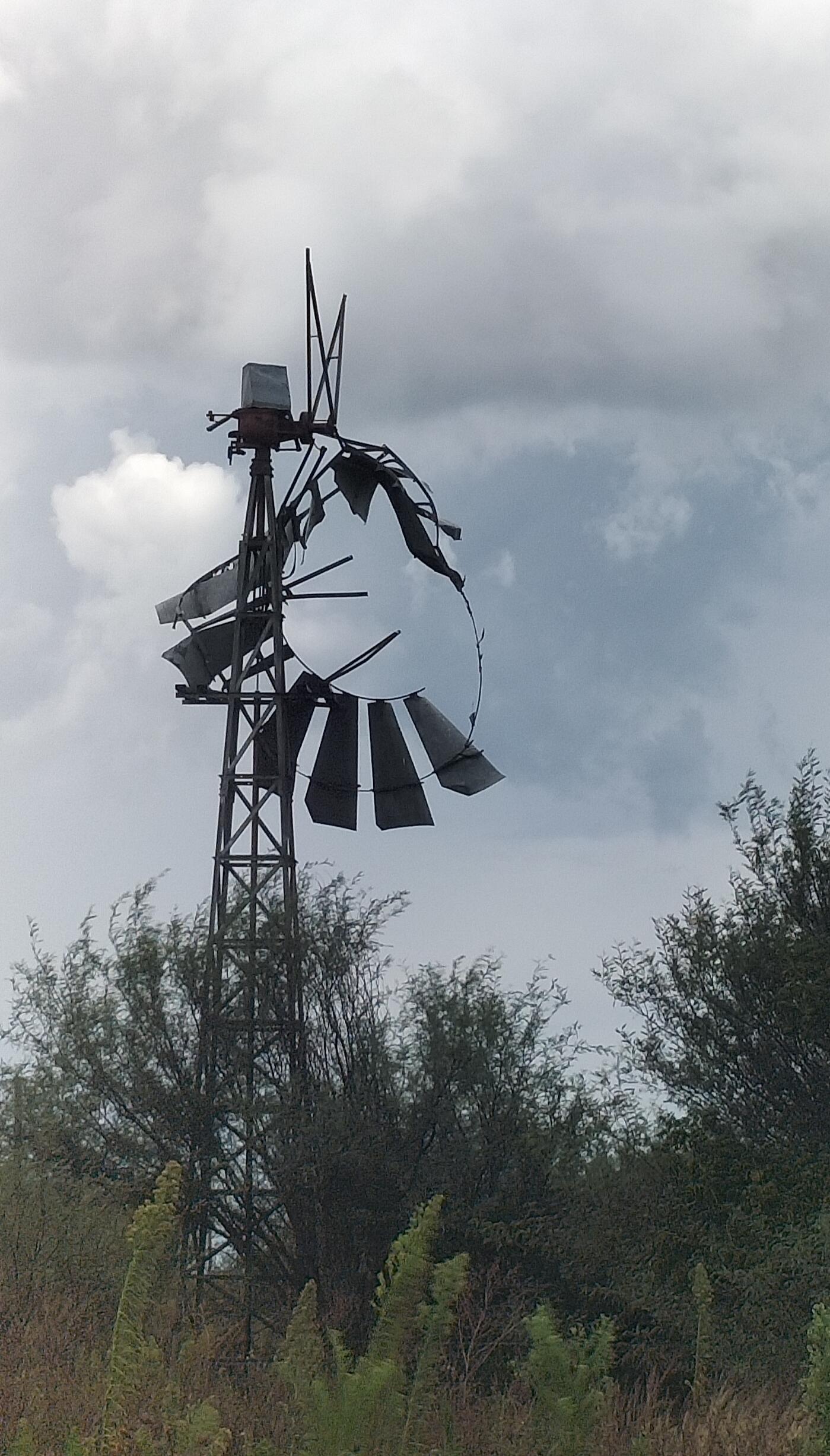 A windpump between Smithfield and Bloemfontein. Although it will still work with one blade missing, if not maintained, it will soon fall into disuse.