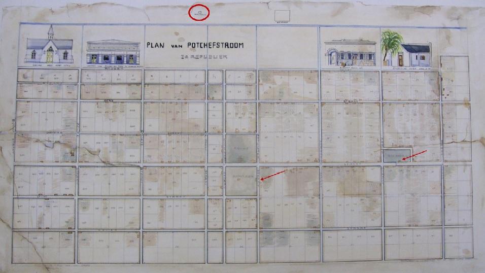 The 1863 map, drawn by Fred Jeppe, showed the gunpowder magazine outside the town (circle top centre). Other places of interest are the first magistrate’s office on the old market square (arrow right) and the second magistrate’s office on the market square bordering on Potgieter Street (arrow left). The map is in the collection of the Potchefstroom Museum.