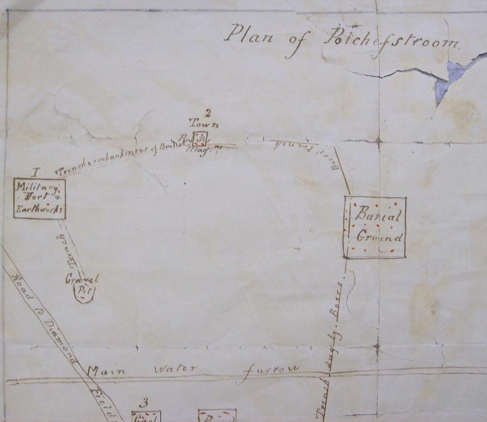According to WJ Badenhorst in Potchefstroom 1838-1938, the trenches of the Boers were made with short turns (not depicted on the map). These twisting trenches were safer since the enemy could not fire down the trench and cause much damage. Badenhorst remarked that D van Graan and F Muller dug the Boer trenches.