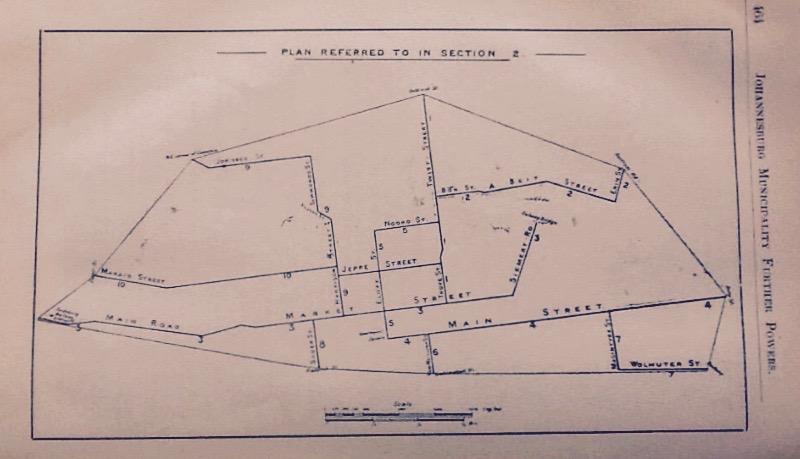 1903 was the year Johannesburg was given the powers to initiate a tramway system with horse drawn trams, commenced in 1905. There is a schedule which includes a plan showing the projected tramway routes. This is an essential item of urban data as it shows that tram routes were planned to run to Braamfontein, Doornfontein, Hillbow and eastward on Main Street towards Kensington.