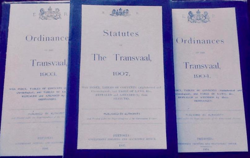 Ordinances of the Transvaal 1903, 1904 and Statutes of the Transvaal 1907. Whoever wants to look at old, dry, dusty, obsolete law books? Law books date, they take up space on shelves and laws are repealed. Legal language is precise and unemotional. The Transvaal ceased to exist in 1994 and today a completely different provincial government structure has replaced the pre 1994 arrangement of four all white driven apartheid provinces and the 10 bantustans.