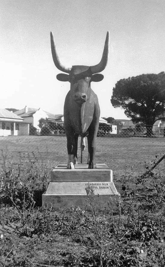 The red ox on the square (Die Plein) in Riebeek Kasteel was built by Christoffel Basson, 1878-1946, in 1938. He apparently had a garage and repair workshop located in Sarel Cilliers Street, today a restaurant.