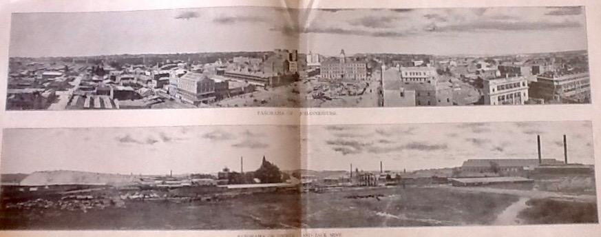 The date of the album is somewhere during the early 20th century, probably post 1905 and pre-1910. The set of images opens with a foldout page showing panoramic views of the two faces of Johannesburg, the modern town with the focal point of Market Square and the second a view of the Simmer and Jack Mine in Germiston.