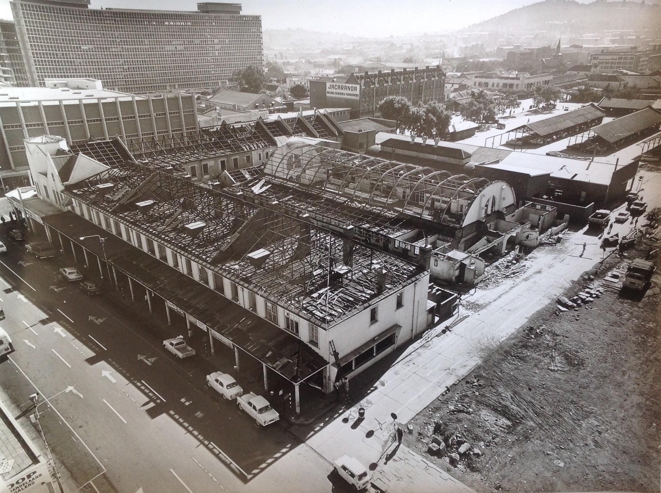 Demolition of the old Pretoria market buildings in progress. The inscription on the photograph states that the domed building in the centre of the photograph was Pretoria’s original art gallery, built by Dotman’s grandfather, van den Berg. The State Theatre was constructed on this site and opened its doors during 1981. The high rise building in the background was Pretoria’s municipal office block built during 1967/9. It burned down during 1997. The architects were Burg Doherty Bryant and partners. The building with the “Jakaranda” signage is the Sammy Marks building designed by de Zwaan during 1903. The smaller white building just visible on the right of the Sammy Marks building is the Kynoch building dating from before 1889. On the far top tight, a portion of the union buildings, completed during 1910, can be seen. Photo by Dotman Pretorius (Circa 1960s).
