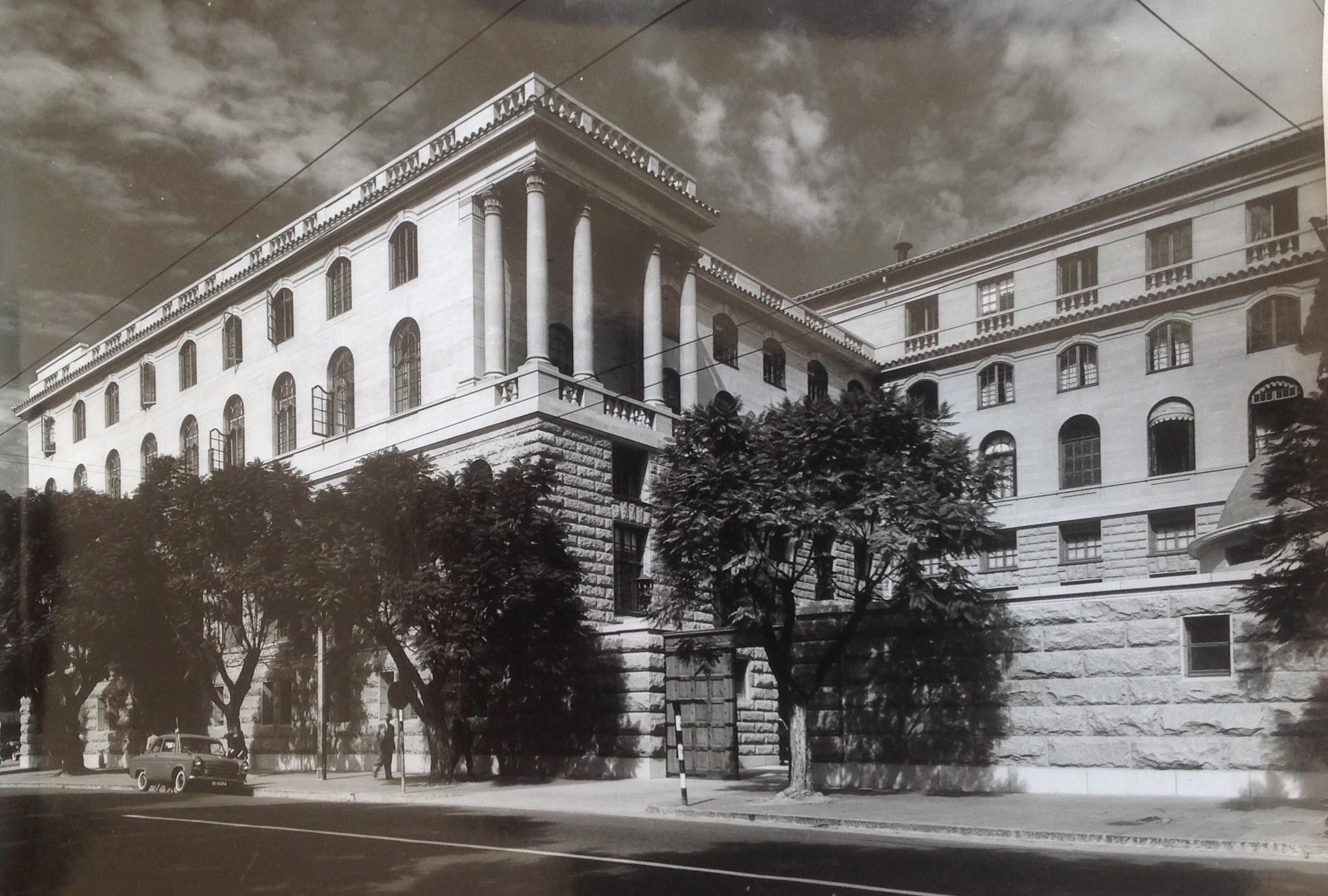The old South African Reserve Bank (SARB) building as seen from Vermeulen Street in Pretoria. The SARB opened its doors on 30 June 1921. The architects for this second building were Baker & Scott. The building was completed during 1930. Photo by Dotman Pretorius (Circa 1960s).