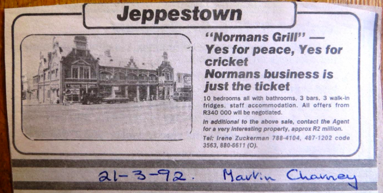 In 1992 the Grand Station Hotel with its jewel Norman’s Grill was on the market for the modest price of R340 000 upwards. At that date it had 10 bedrooms all with bathrooms, 3 bars, 3 walk in fridges and staff accommodation. Still attractive but no longer a prime hotel. (JHF records)