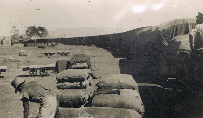 Workers at Union Glass loading sacks onto train (Talana Museum)