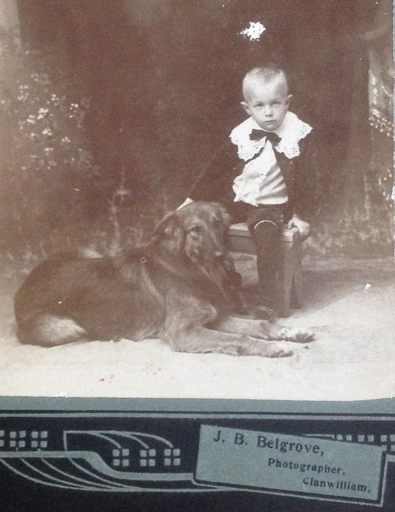 Unknown child with pet dog. The head of the dog is slightly blurred due to movement during the photographic exposure time. Cabinet format photograph by Kimberley based photographer Selkirk – Circa 1895
