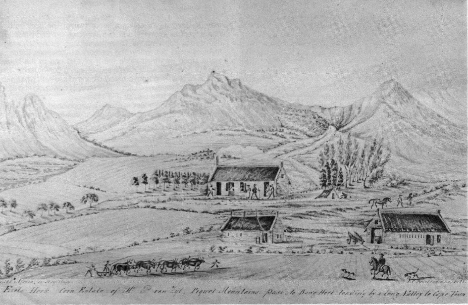 Over the pass north of Banghoek lies the farm Eselshoek, which Poortermans described as the 'Corn Estate of Mr P. van Zyl. Piquet Mountains. Pass to Bang Hoek, leading by a long Valley to Cape Town'. The Poortermans painting depicts two dwellings and a wagonshed. What appears to be the principal dwelling has an entrance near one end of the front and this part is illuminated by two shuttered windows. At the opposite end is shown a second doorway, leading to a buitekamer. This building, the walls of which were built up of layers of mud mixed with chopped straw and cow dung, was still in existence in 1965. The windows had been filled in and an extension had been added at one end, as is shown by a break in the thatch, but the building portrayed by Poortermans was still easily recognizable.