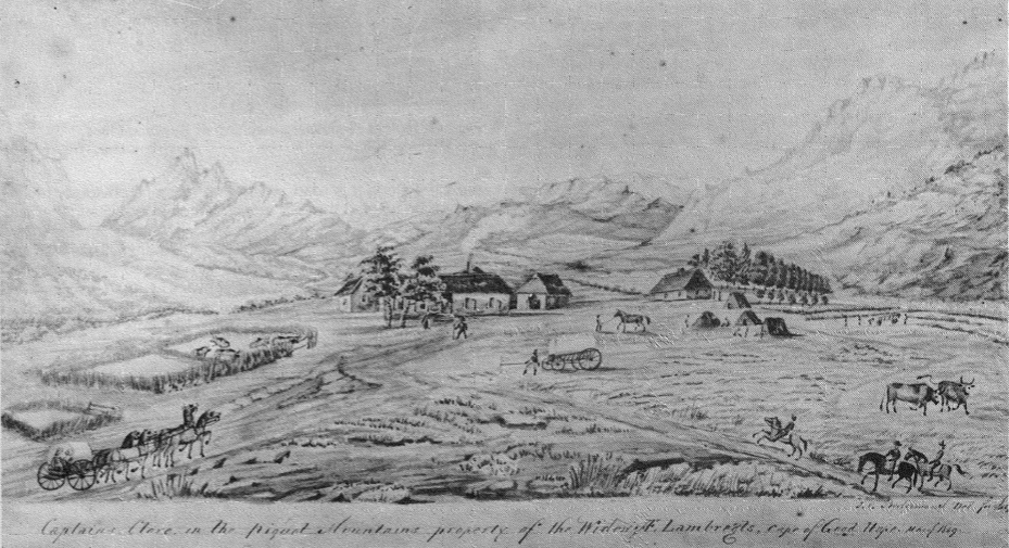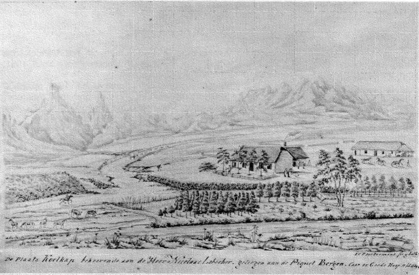 Large tracts of the Piquetberg were granted as loan-places between 1720 and 1730 and three of the places which Poortermans illustrated, Kapteinskloof (Kapiteyns Kloof), Groenfontein (Groene Fonteyn) and Rietkloof, are marked on the Abbe de la Caille's map which he compiled in 1751-2. Groenfontein was an early loan-place and it continued as such until 21 November 1831, when it was granted as a perpetual quitrent holding to Hugo Lambrechts, grandson of Amos Lambrechts of Leiden, who died in 1728.