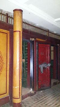 The room still retains its beautiful decorated green tiles half way up the walls, and its small green and white floor tiles. It has a high ceiling, and on one side, the glass doors of the manager's office.