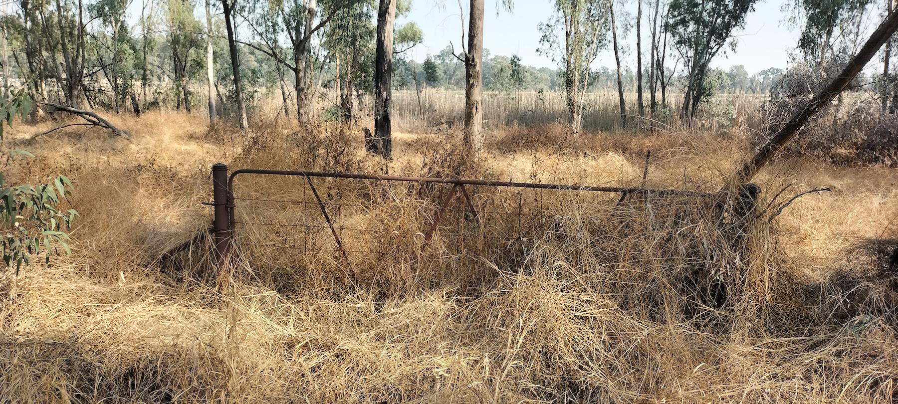 An elementary “collapsible” farmgate standing in a field overgrown with reeds on a farm between Harrismith and Bergville. The initial purpose of this gate has long faded as it has not been in use for many years.