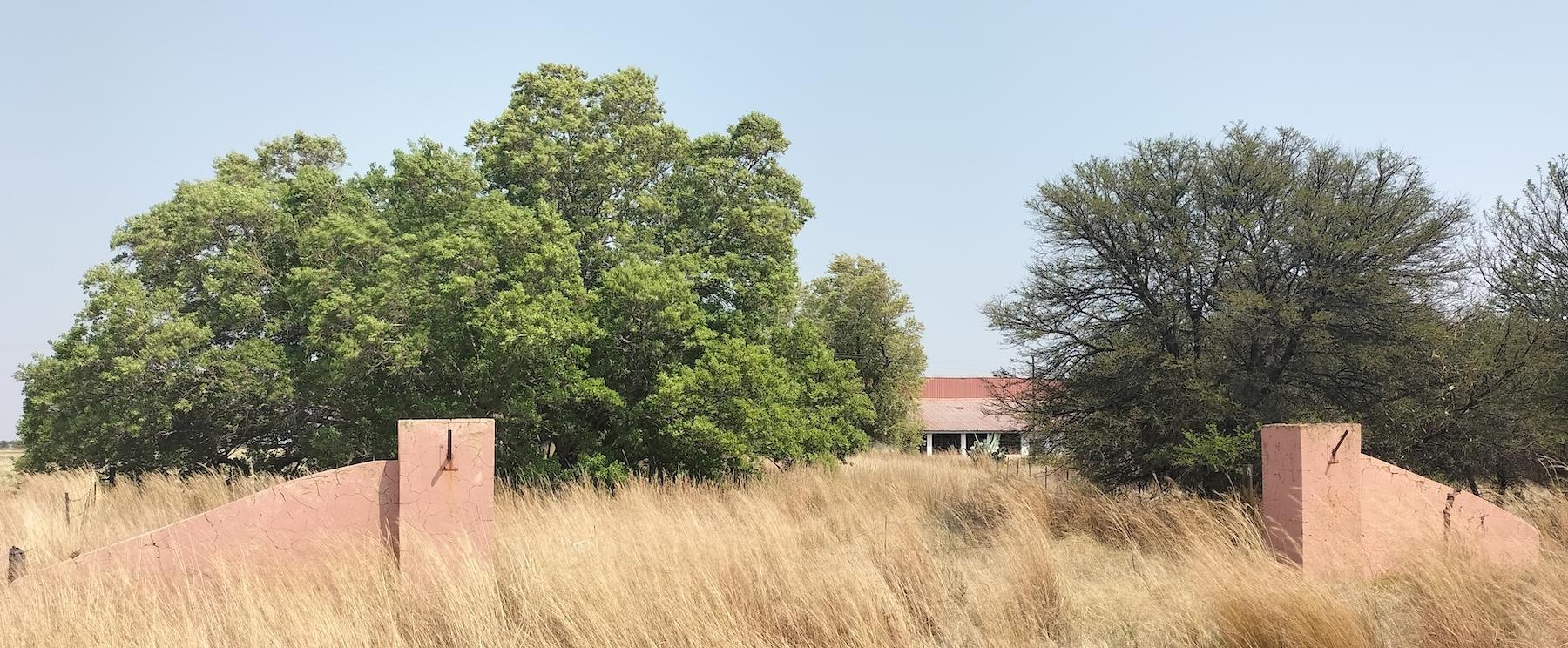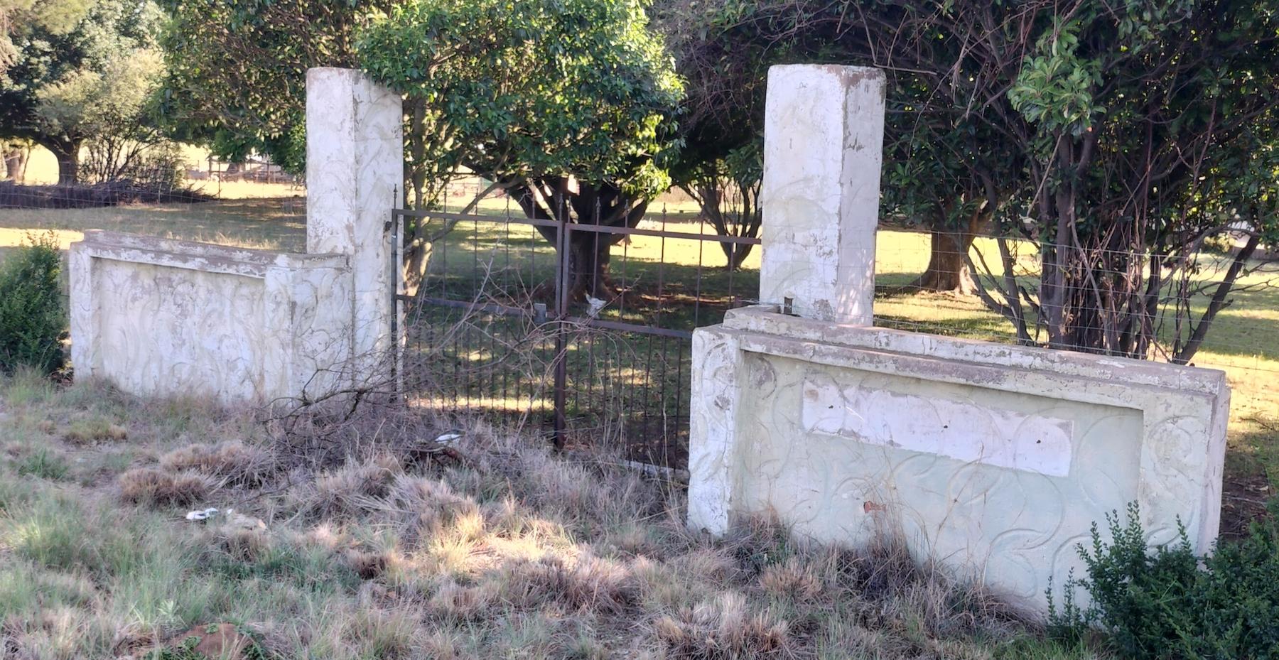 A plastered brick-and-mortar wall providing access to a plot between Volksrust and Standerton. Although the house in the background is still being occupied, the entrance to the property has been moved. It is assumed the reason for moving the entrance was because the national road runs too close to this original entrance, making it an unsafe entrance and exit point