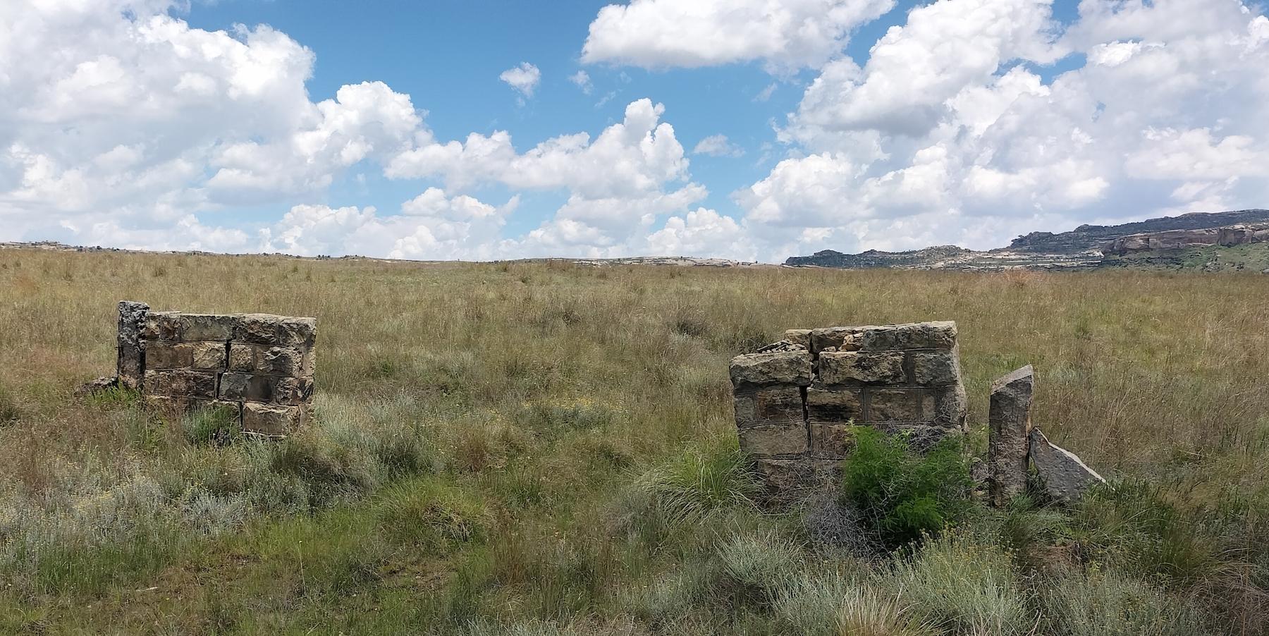 Two sandstone pillars standing forlorn. These pillars, fairly common in the Free State Province, were used as corner support units for fencing around farms or as gate posts. There would have been an elementary “collapsible” gate spanned between these two pillars, which stand in the Golden Gate Highlands National Park.