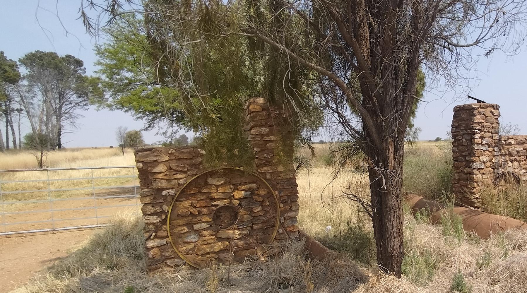 North-West Province. The tree in the driveway of this stone-pillared gate, with the wheels of a farm implement built into it, gives a sense of how long the gate has been in disuse. Note the steel gate on the left, which is now provides the primary entrance to the property.
