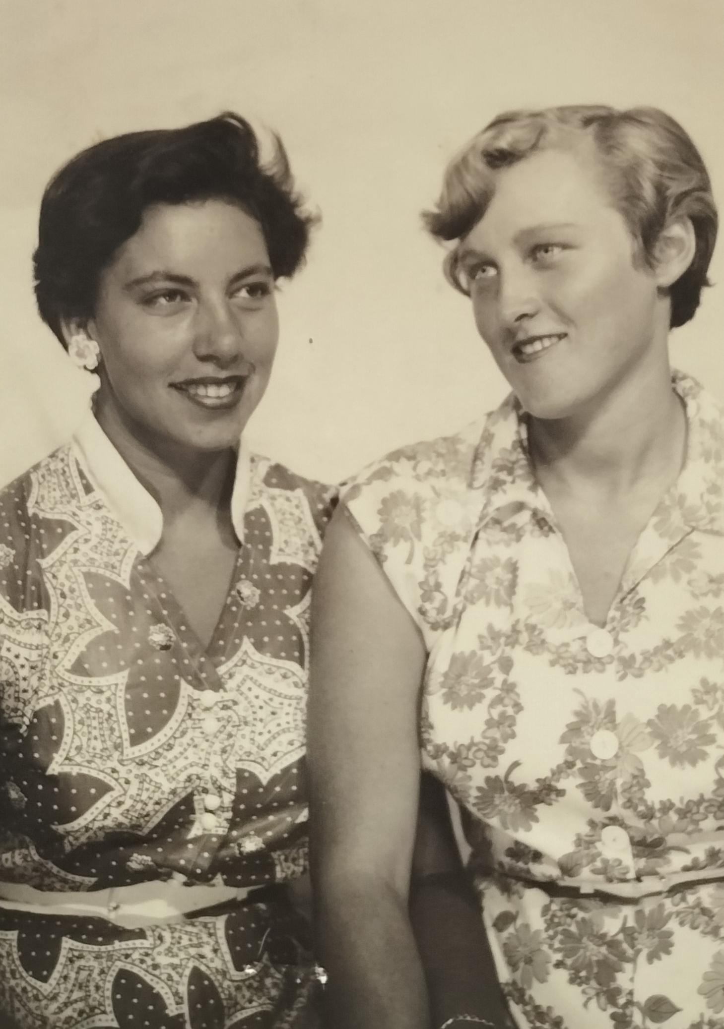 Two unknown ladies having fun in a photobooth (circa 1960)