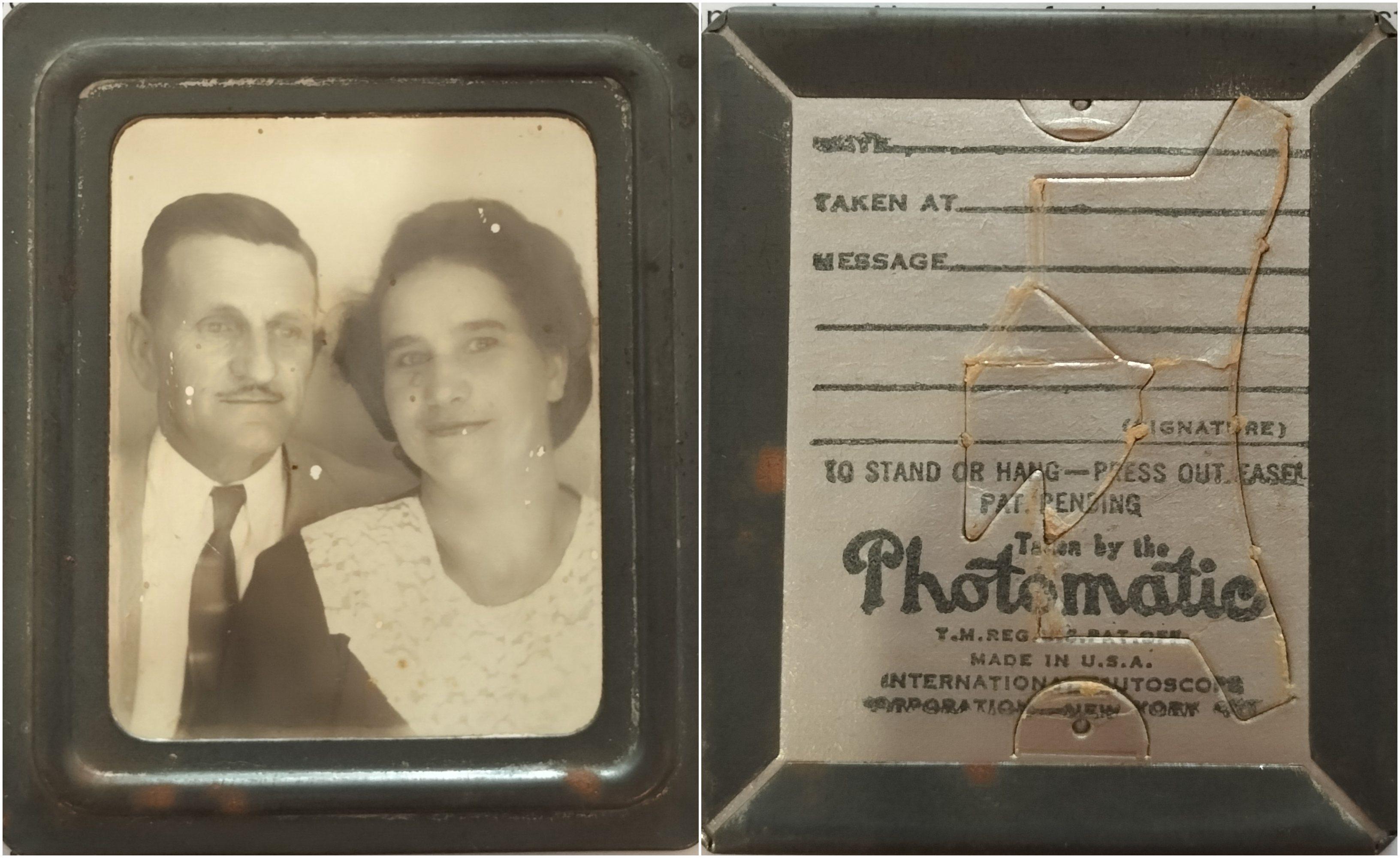 Unknown couple in a Photomatic photobooth (circa 1960). The small-format photograph is framed in a small metal frame. The back of the above photograph confirms the origin of the photograph, namely a Photomatic photobooth.