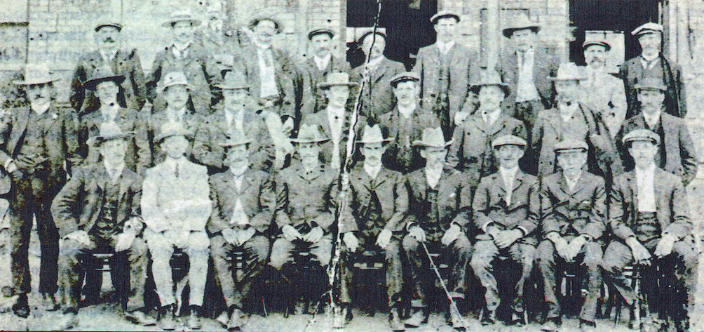 Very poor photo of the 21 carpenters in 1910, the year that George Bright won the King's Cup at Bisley in England (Cullinan Mine Archives)