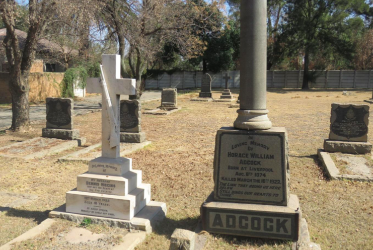 In this cemetery are four black granite tombstones to Constables Frederick Henry Ludwig Howe (killed 10 March), N. A. C. Kruger (killed 10 March), Benjamin Hannant (killed 10 March) and Sergeant F. W. Hooper (killed 12 March). There is a broken white marble tombstone, in memory of Constable Addison Ridley Jordan. There are also the tombstones of Dennis Higgins and Horace W. Adcock who were most likely members of the Special Police contingent. Lastly, there is a black granite tombstone to Sergeant H. H. Roux of the Transvaal Scottish Regiment, killed at Brixton Ridge. These graves are all positioned closely together in the old English (Anglican) precinct near the south-western perimeter. Park at the cemetery offices and walk about 100 meters towards the south-west.